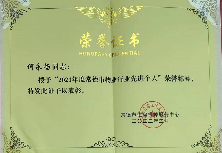 常德市康都物業(yè)服務有限公司被評為2021年度常德市優(yōu)秀物業(yè)服務企業(yè)、公司法人及員工被評為2021年度常德市物業(yè)行業(yè)先進個人的表彰。